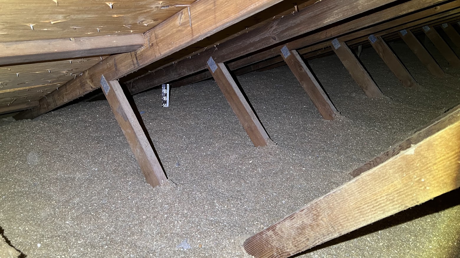 If you have a larger attic or need more insulation, you might consider blow in fiberglass or cellulose insulation. Many home improvement stores will offer free use of a blower with a minimum number of bags purchased. Before you start, it’s helpful to measure and mark your intended depths on the attic truss structures with a marker or cardboard insulation ruler. You’ll need a couple people; one to feed bags of insulation into the machine while the other persons controls the blower hose.