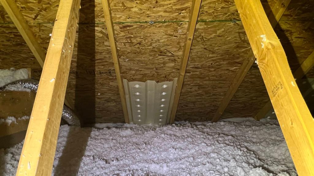 Make sure you do NOT fill in the gaps leading to your exterior eaves or soffits. These need to remain open to allow for airflow. You may even need to staple inexpensive vent chutes (shown below) to the bottom of the roof to prevent your additional insulation from blocking these gaps.